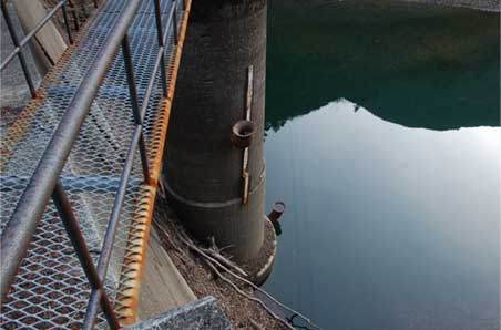 昔はハンドルが並んでいたであろう取水塔の天辺には現在はこのようにハンドルの軸だけでした。