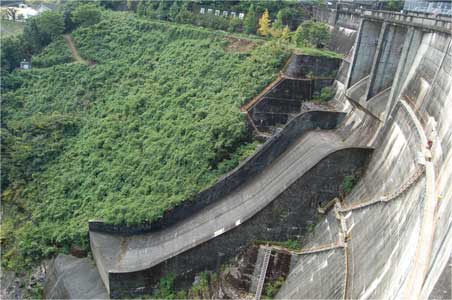 川に対して堤体の向きが斜めだったりすると片方だけバンクをつけてあったりもしますが