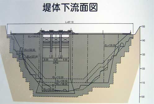 農水省初のコンクリートダム。 堤頂長97.1m 堤高42.4m 堤体積48,434m