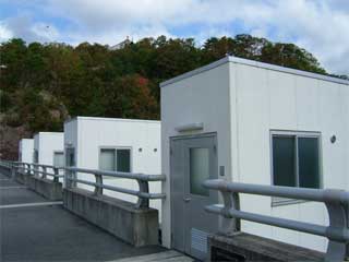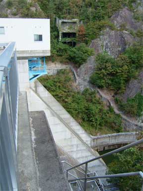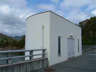 天端右岸から見たらこんな感じです。 左のダム湖側に取水塔。 右の下流側にゲートです。
