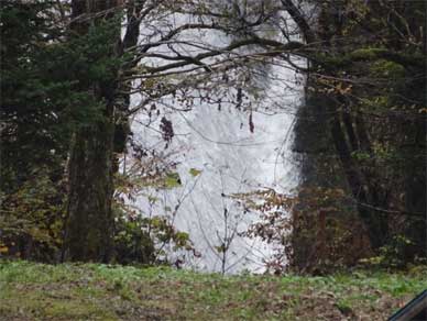 その周囲の木々の向こうに白い瀑布。