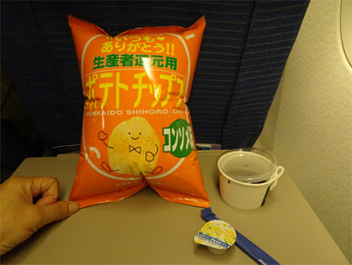 鉄板お約束の飛行機の機内でパンパンになったポテチ袋写真。