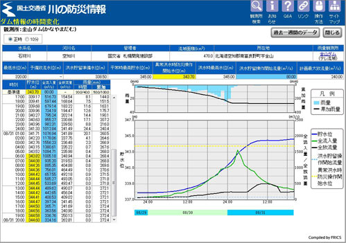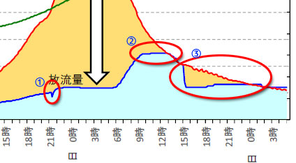 とんでもない流入量(緑の線)に対して8月30日からじわじわ放流量(黒の線)は増えていきます。