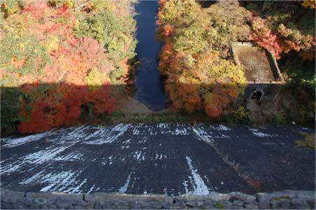 見下ろすと下に余水吐水路ですが影になってよく見えていませんね。