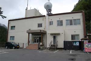 管理所と山の間に渡らっしゃい吊橋への道・瀬戸合峡遊歩道入口があります。