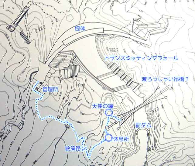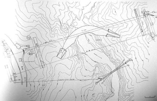 休息所のあった場所には堤体のコンクリート打設のバケットクレーンをガイドする