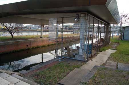 あの背の低い方は淀川大堰の予備ゲート格納庫なんです」