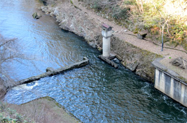 直下には水位観測局舎と川を横断するコンクリートの堤。
