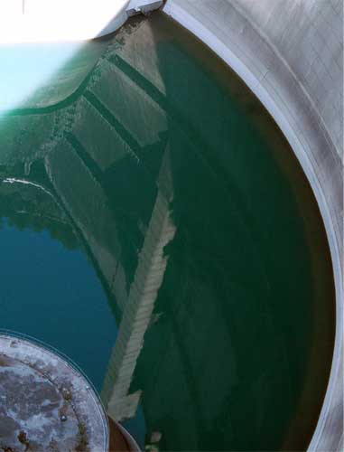 今は静かに美しいアーチを映している減勢工の水面。