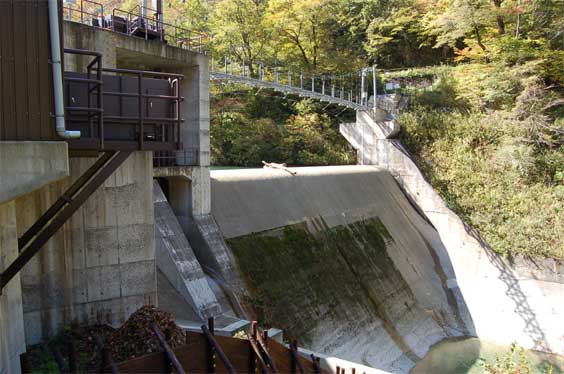 吊り橋の影が堤体のカーブに沿って落ちているのが素敵です。