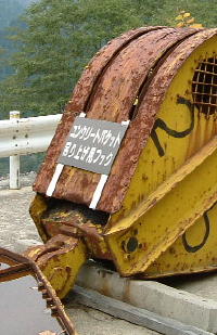 天端への道を下っていくと40年前に活躍していた工事機械を