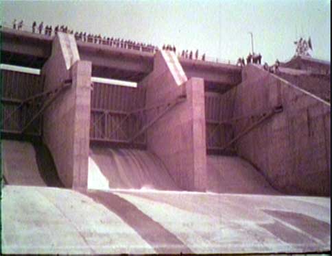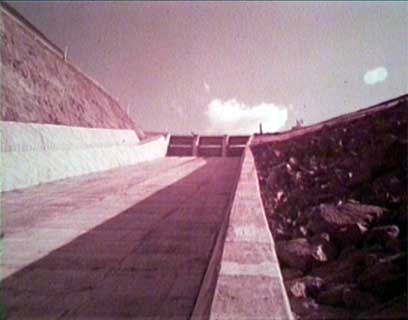 完成した九頭竜ダムを洪水吐水路直下から眺めているところ。