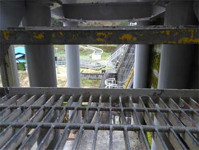 階段のステップの隙間から堤体を覗く。