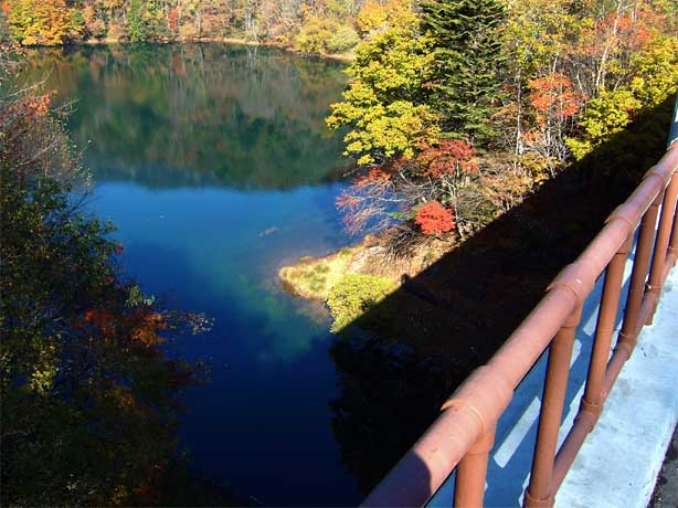透き通った水。真っ青な空が映り込んで紅葉の赤と黄色と針葉樹の緑と五色の競演。