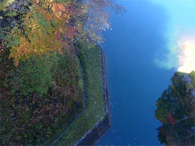 そして乗り込んだ天端でいきなり下流側に凄い紅葉と水の競演を見てしまったのです。
