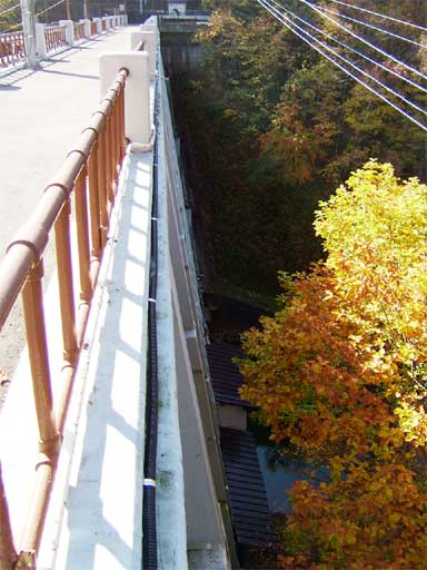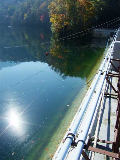 天端からでダム湖側を見ると水圧鉄管が見えました。