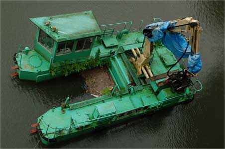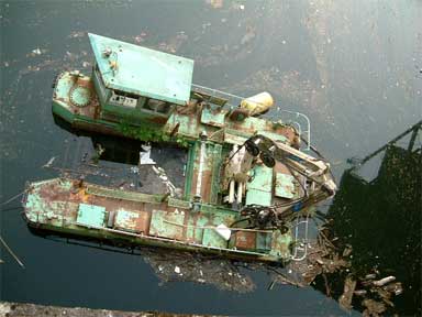 そして左岸に移動中、ダム湖に除塵の為の船を発見。
