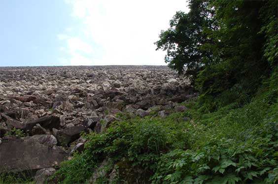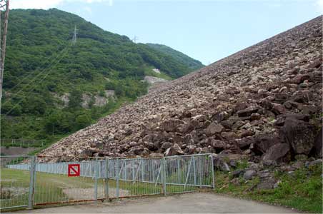 ロックフィルを真下から見あげた時のこの壮大な風景。
