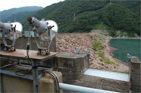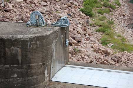 洪水吐き水路の上に架かる橋から天端を見た所です。