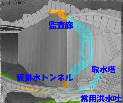「常用洪水吐に使用している仮排水トンネルはここを通っています」