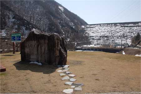 道路を渡って御母衣ダムの名碑と堤体。