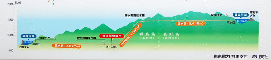 導水路と水圧鉄管とダムの位置断面図。
