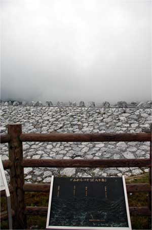 はたと説明板から顔をあげると堤体がガスに覆い尽くされそうになっています。