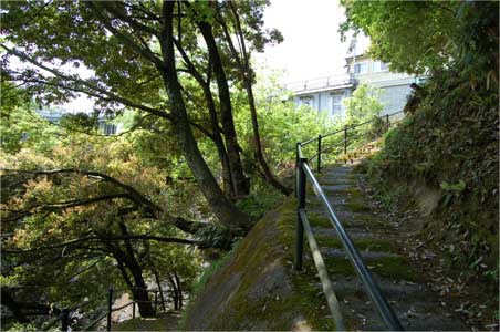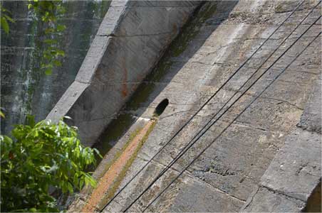 つづら折りの管理道路の途中から左岸土砂吐を間近に見たところ