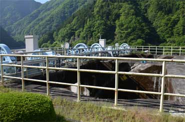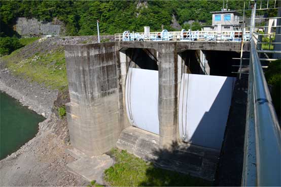大白川ダム右岸のトンネル式洪水吐と同じラジアルゲート。 大白川は1門だけど水窪は2門なんですね。