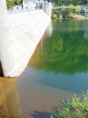 上流側の傾斜とこの壁の垂直な具合から考えると堤体内に三角の空間がありそうです。