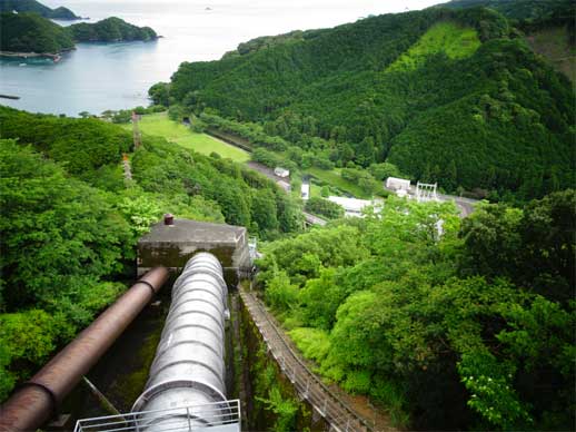 水圧鉄管を流れ下って下に見えている発電所で電気を作り
