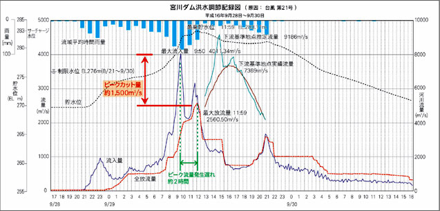 宮川ダムのT0421洪水調節時のハイドログラフです。