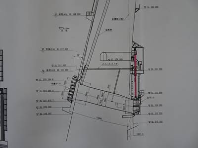堤趾導流壁があって普通のダムっぽいですが主役の底部放流設備は