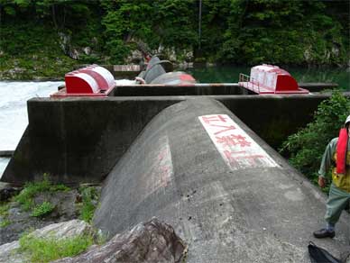 先日、改造工事が完成した耳川の山須原ダムの仮締め切りSR堰で