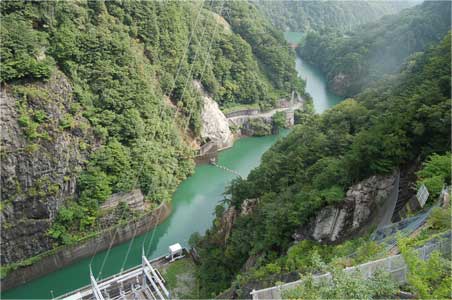 天端のの下流側歩道を歩いてテプコ館に戻る途中見下ろした下流側。