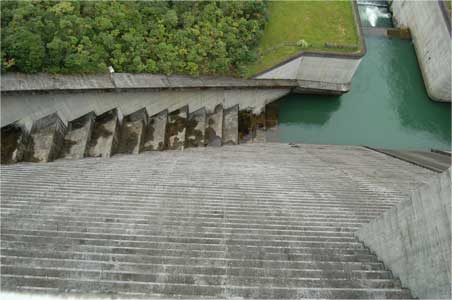 堤趾導流壁の内側にある段々と堤体下流面の段々の比べっこ。