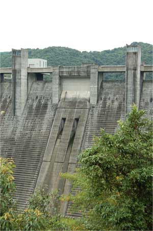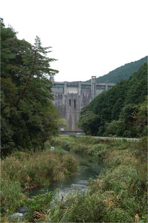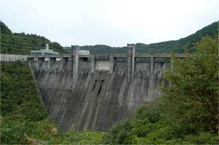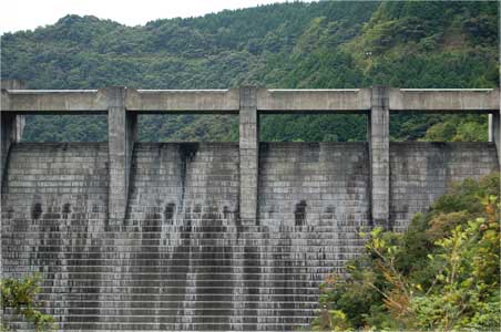 この高さから見るとクレストの洪水吐から向こう側が見えるんですよ。