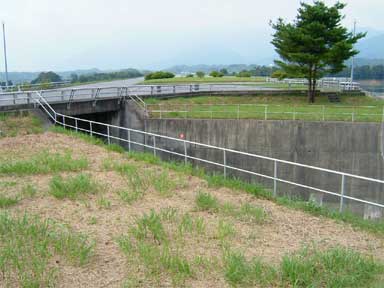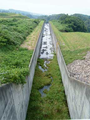ほのぼのしている中里ダムで唯一、コンクリートが目立つ余水吐水路部分です。