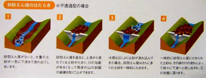 いずれも土石流、流木をダムで捕捉して下流への流出量を減少、到達時間を遅らせるという働きを持っています。