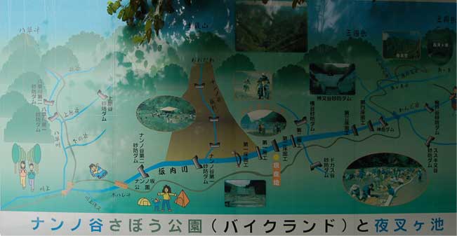 このようにナンノ谷の砂防とバイクランドと夜叉が池の説明板も立っています。