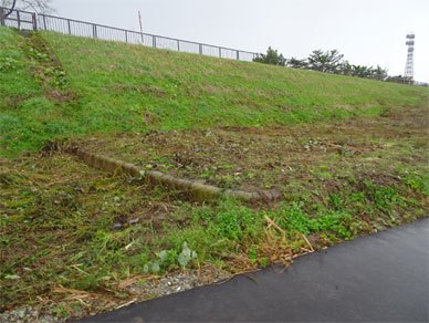 その説明板のずっと下、堤防の法面の下にある石積みの基礎部分。