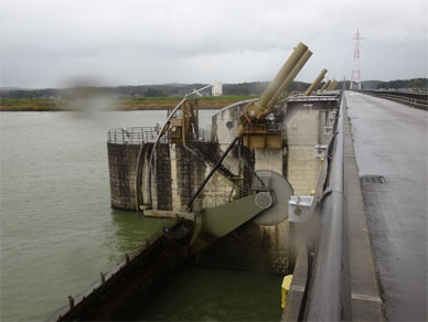 従来型河口堰にありがちな大きな建屋とピアに巻揚機とシェル構造ローラーゲートが無くって