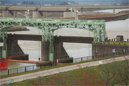 信濃川の水量をコントロールする信濃川水門。