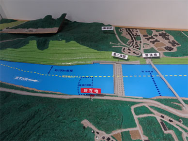 この模型で黄色の点々で示されているのが現在の分水路左岸のラインです。