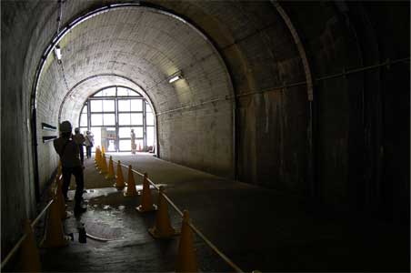振り返ると仮排水路を締め切ったような大きなトンネル型の空間と