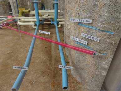 手前に伸びている水色の管が多々良木ダムの貯水池にあった1号、2号取放水口へのルートです。
