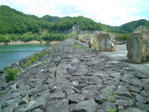 天端です。下流側には緑。ダム湖側には大きな岩が並べてあります。