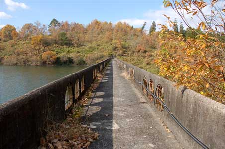 水の流れと逆に見学を進めて女子畑第二調整池ダムにやってきました。