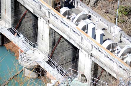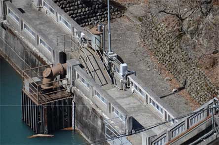 下流側からみれば左岸側の二つのゲートと右岸側の二つのゲートは越流高が違うらしい。