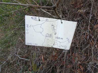 手作り案内図が灌木に取り付けられていました。